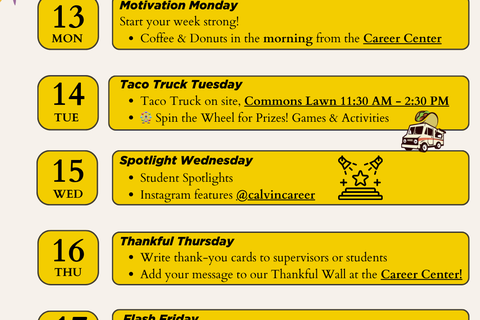 Welcome to the Calvin University Career Center, where we empower individuals to embark on a journey of self-discovery, growth, and purpose.